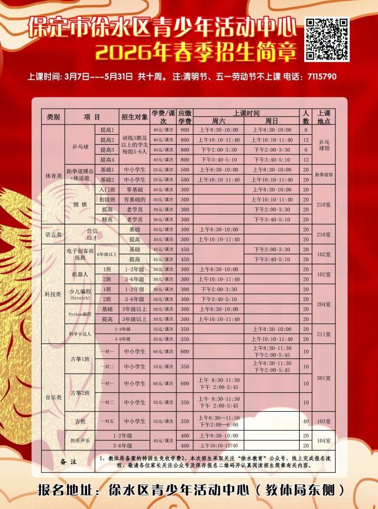 您好!徐水区青少年活动中心2026年春季招生报名工作即将开始,欢迎您的孩子到来!其作为我区唯一一所公办校外青少年素质教育活动场所,在课程设置方面与学校教育紧密衔接;在收费方面始终坚持公益性、普惠性;在教学方面以美育、体育、科技、品德教育等为育新目标,开展丰富多彩的教育实践活动,为您的孩子全面发展提供优质的兴趣爱好支持。本期招生采用线上报名方式,具体如下: